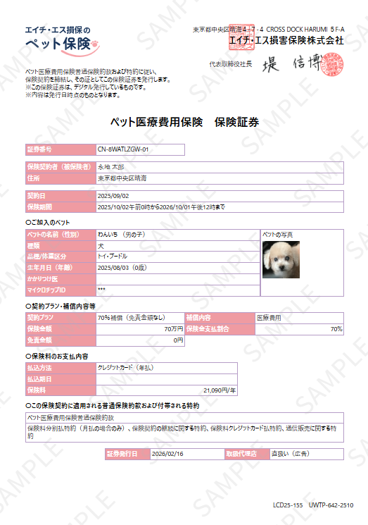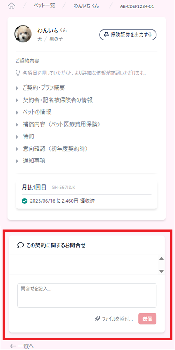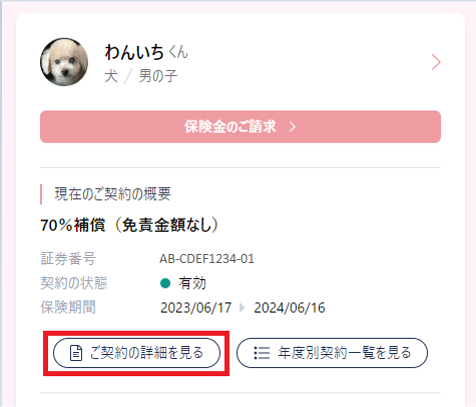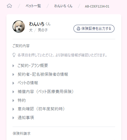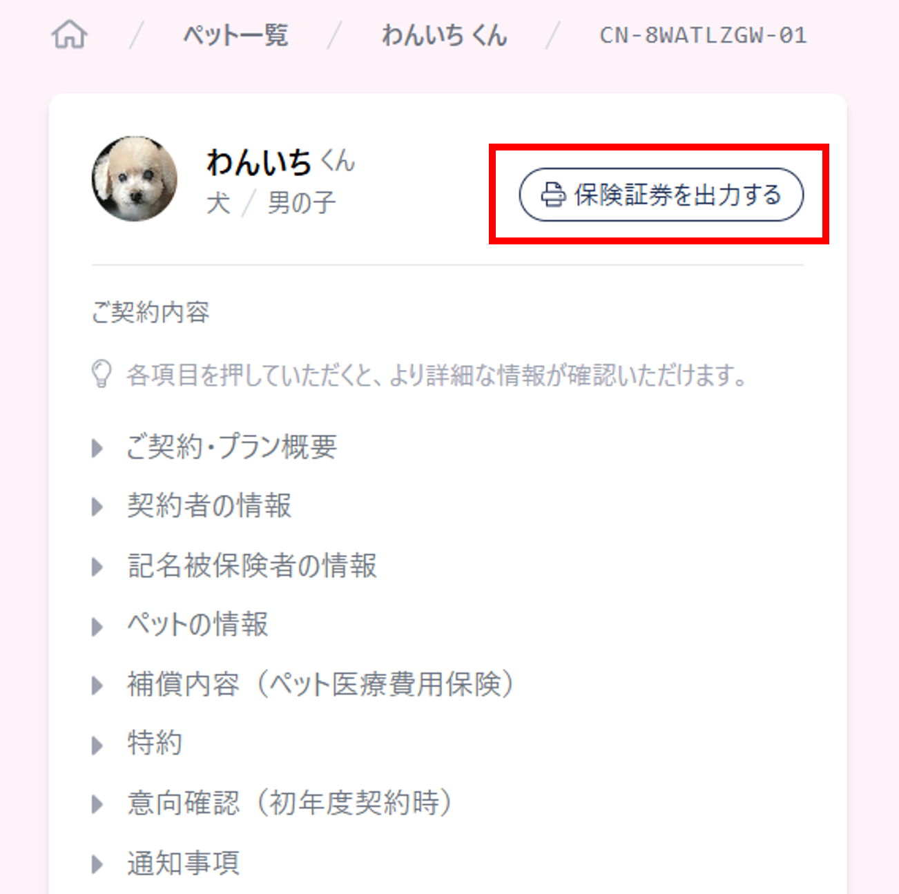 対象のペットのご契約欄にある「ご契約の詳細を見る」をクリックしていただきますと、ご契約内容が表示されます。「保険証券を出力する」をクリックしていただきますと、保険証券が表示されます。