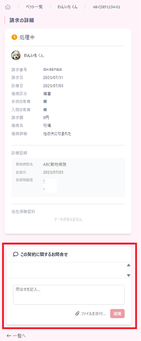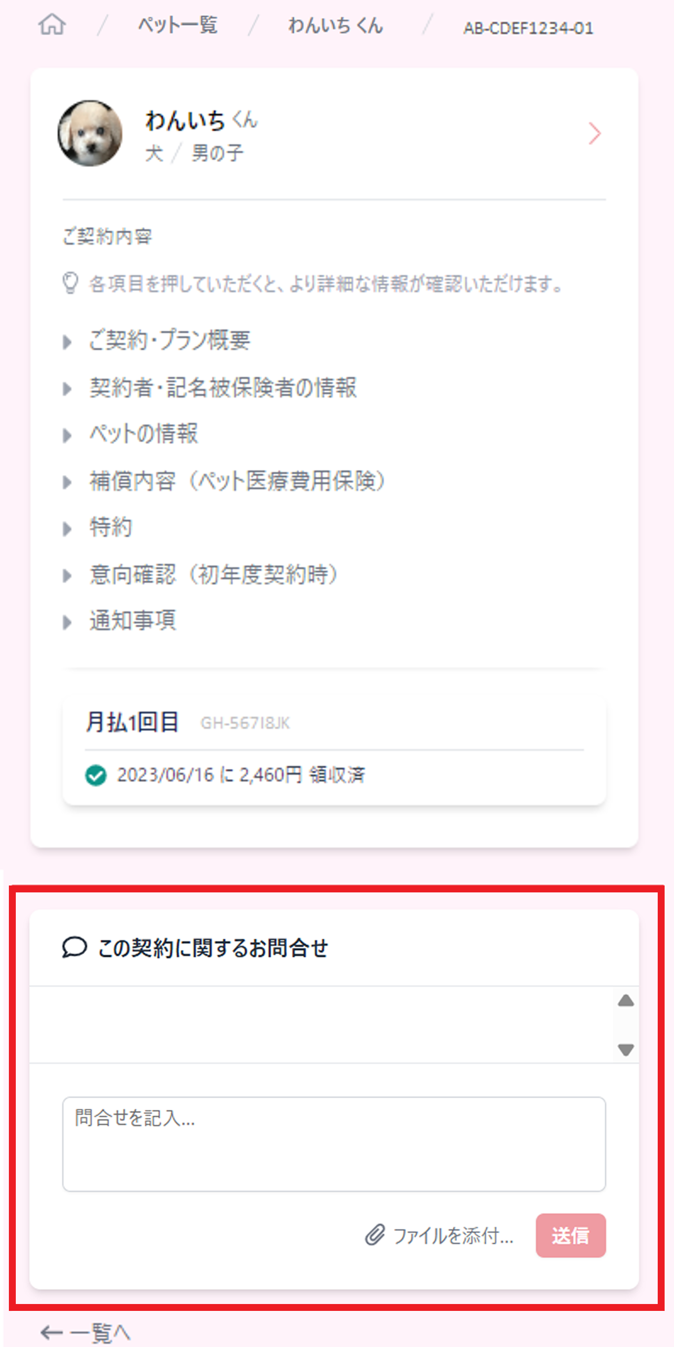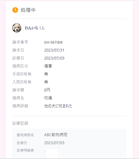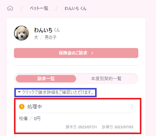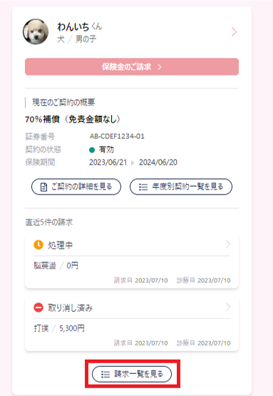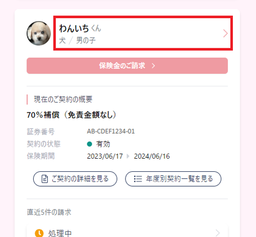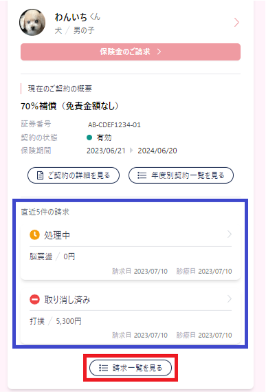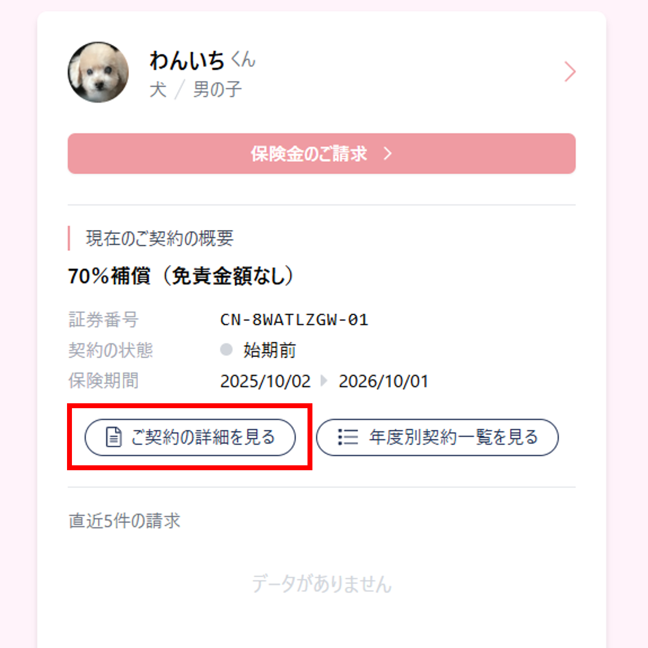 ペットマイページのトップ画面、対象のペットのご契約下部に、直近情報が表示されます。