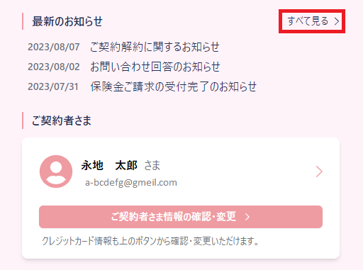 トップ画面の上部の「最新のお知らせ」から「すべて見る>」でご確認いただけます。