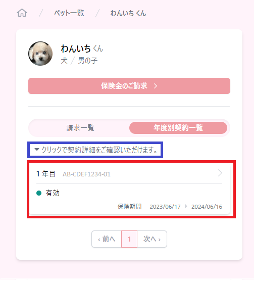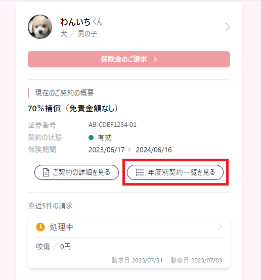 対象のペットのご契約欄にある「年度別契約一覧を見る」をクリックしていただきますと、現契約とこれまでの契約の一覧が表示されます。