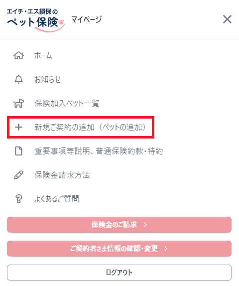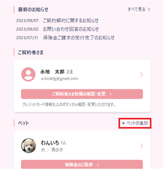 新規ご契約の追加(ペットの追加)とご解約がお手続いただけます。