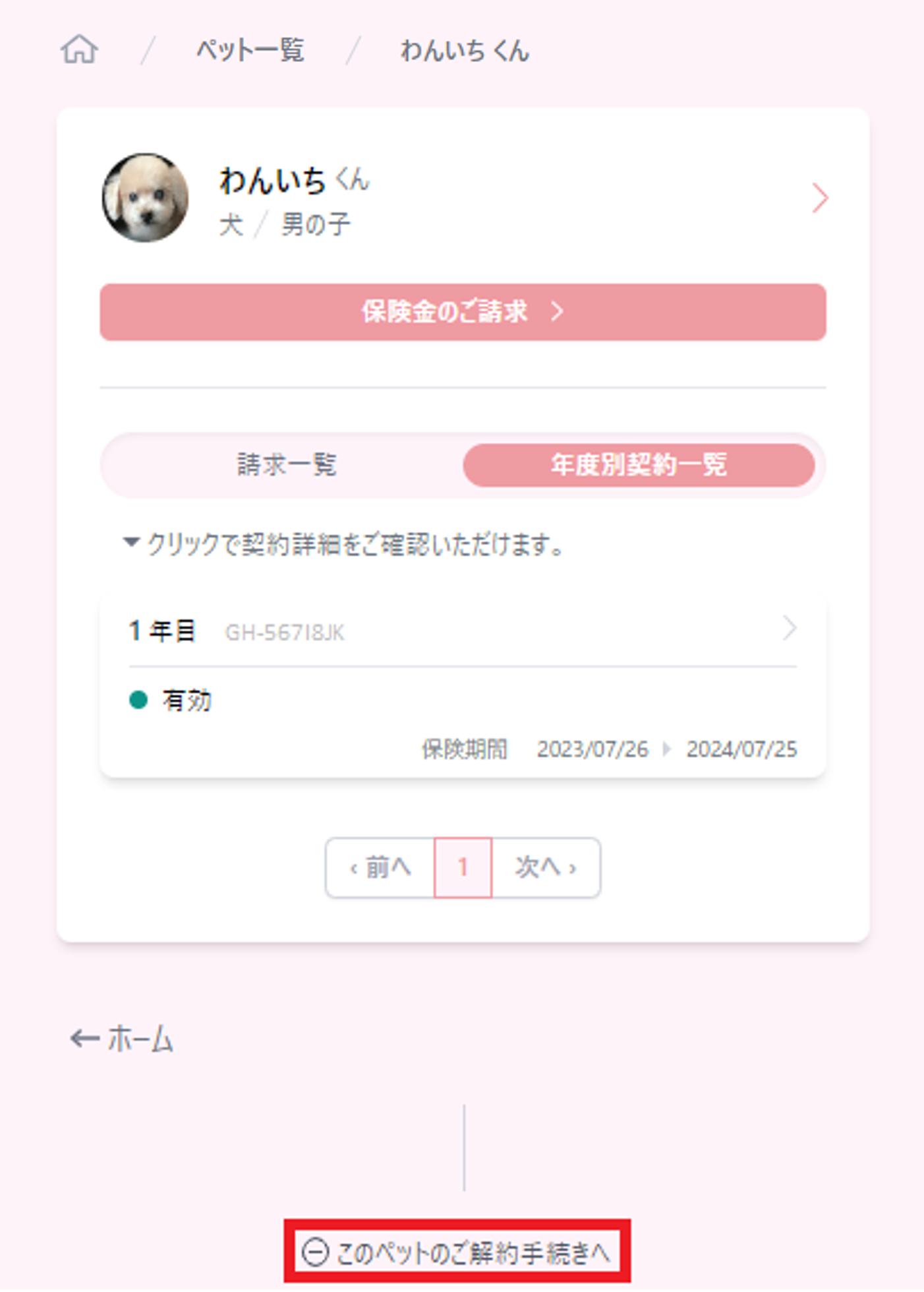 対象となるご契約をクリックしていただき、次画面の最下部にある、「このペットのご解約手続へ」をご選択ください。