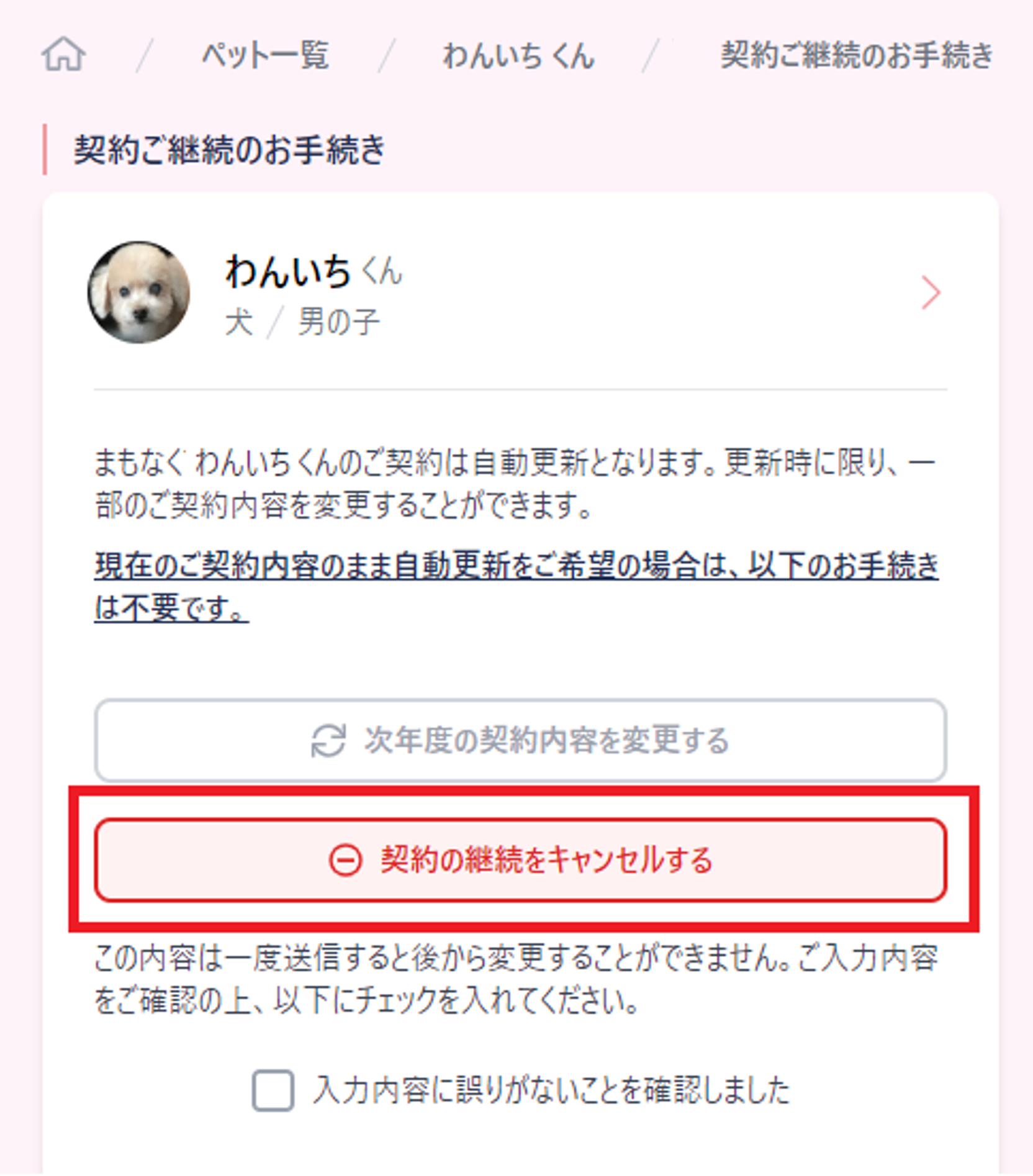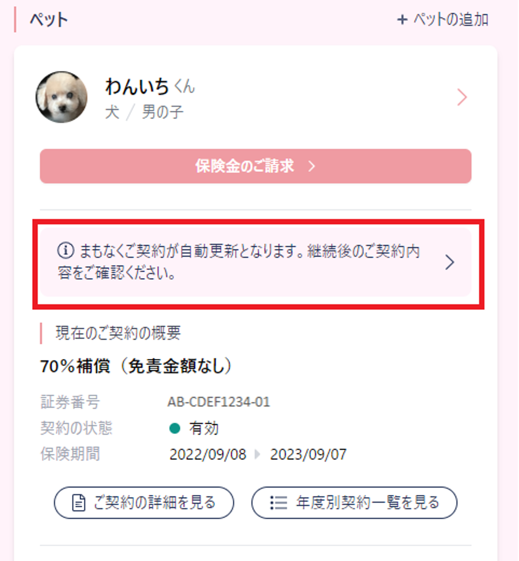 ※ご継続契約の手続期間中(現契約の満期60日前から30日前まで)のみペットマイページに表示されます。