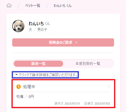 ご覧になりたい請求をご選択いただきますと、請求に関する詳細情報がご確認いただけます。